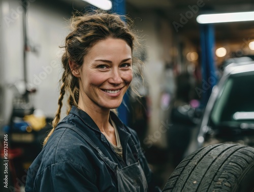 A female mechanic smiling and holding a tire in a car repair shop. She exudes confidence and expertise.