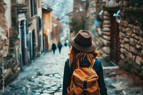 A female traveler seen from behind, exploring the historical streets of a city. Embodies the concept of vacation travel.