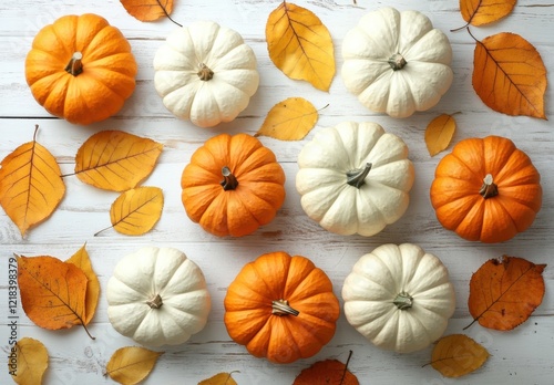 A Festive Arrangement of Orange and White Pumpkins Surrounded by Autumn Leaves on a Rustic Wooden Table, Perfect for Seasonal Decor and Harvest Celebrations
