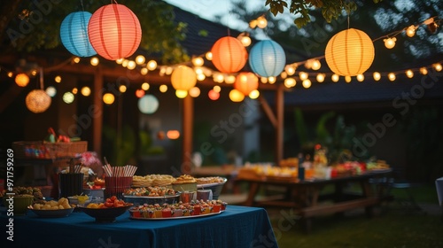 A festive backyard party features a beautifully decorated table with an array of delicious food, vibrant lanterns, and warm string lights illuminating the evening