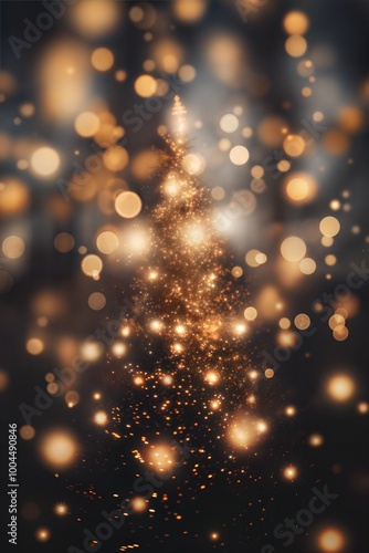 A festive, blurred image of glowing golden lights arranged in the shape of a Christmas tree. Ideal for holiday cards, invitations, or festive designs.