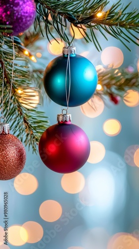 A festive close-up of holiday ornaments hanging from pine needles, with warm, glowing bokeh lights creating a magical Christmas backdrop.