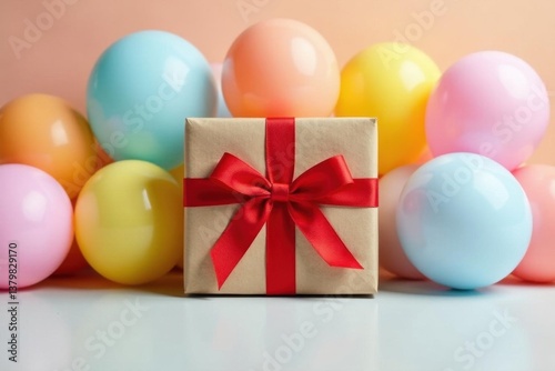 A festive gift box adorned with a vibrant red ribbon, nestled amongst a delightful cluster of pastel-colored balloons, creating a cheerful and celebratory scene.