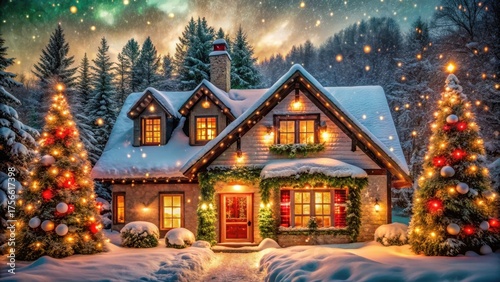 A Festive Home in a Winter Wonderland Snow-Covered House with Illuminated Christmas Trees and Garland