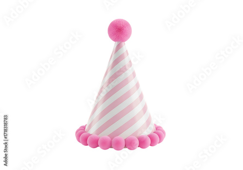 A festive pink and white striped party hat with a fluffy pom pom on top isolated on transparent background