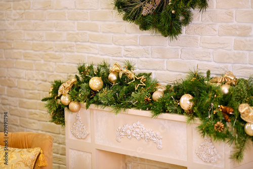 A festive room. New year. A bright beige room Christmas décor, pine green decoration, balls, toys.
