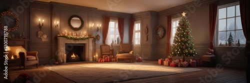 A festive room with Christmas decorations and a New Year's Eve countdown, confetti, party