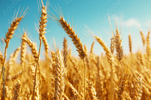 A field of golden wheat with a clear blue sky in the background