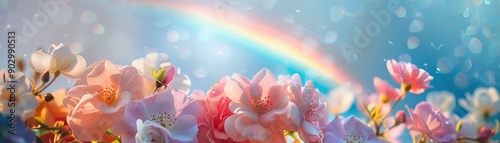 A field of pink flowers with a rainbow in the sky. The flowers are in full bloom and the rainbow is bright and colorful. The scene is peaceful and serene, with the flowers
