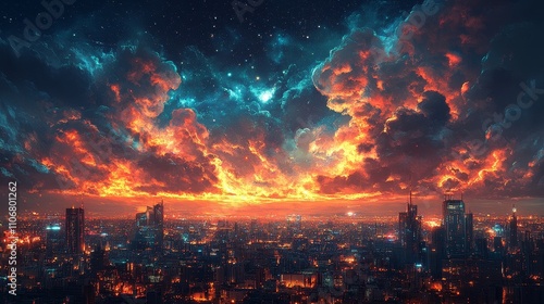 fire, sky, city, night, cloud, star, city landscape, orange, blue, yellow, red, glow, dark, smoke, futuristic, urban, horizon, night sky, building, light, metropolis, fantasy, surreal, abstract, vibrant, dramatic, intense, dazzling, sparkling, magical, aethereal, illumination, ambient, cosmic, dreamlike, atmospheric