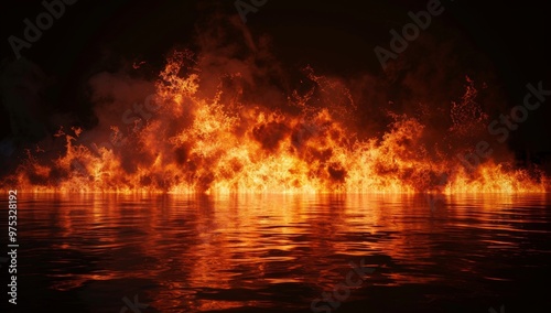 A fiery explosion is reflected in the water