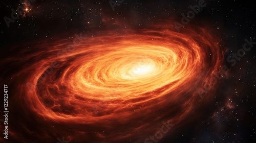 A fiery red nebula swirling with shades of orange and yellow, set against a black star-filled sky.