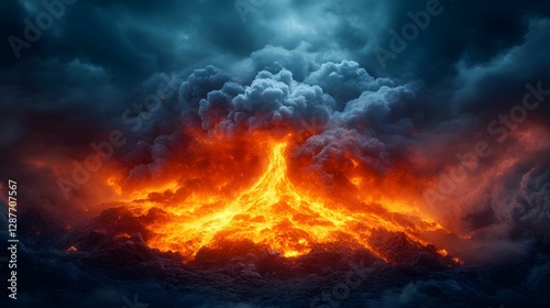 A fiery volcanic eruption against dark, stormy clouds, showcasing glowing lava and ash in a dramatic, natural display of power.