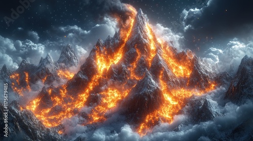 volcano, eruption, lava, mountain, cloud, fire, smoke, landscape, nature, scenery, dramatic, energy, heat, rock, ash, environment, geology, sky, illumination, wilderness, beauty, power, night, magma, chaos, earth, terrain, explosion, light, warmth, contrast, adventure, exploration, atmosphere, danger, force, surreal, high-coloured, majestic, awe, spectacular, phenomena, natural, breathtaking