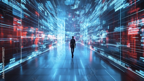 A figure walking through a futuristic digital corridor filled with glowing data streams.