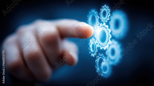 A finger interacts with glowing digital gears, symbolizing innovation and technology.