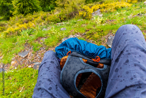 A first-person POV shot of a female hiker sitting with a backpack while it's raining in the French Alps (Valberg, Alpes-Maritimes, France)