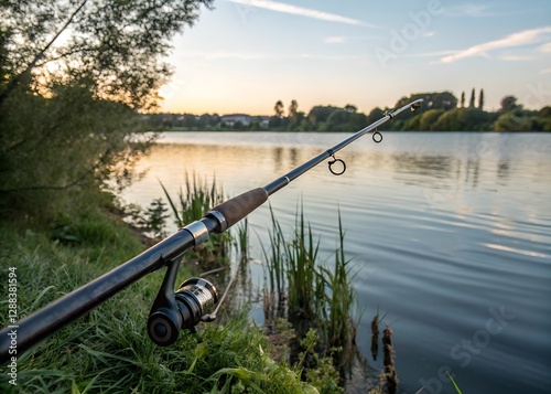 A fishing rod icon with a lake in the background