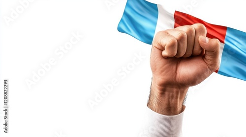 A fist raised triumphantly, holding a flag with blue and red colors, symbolizing strength and unity.