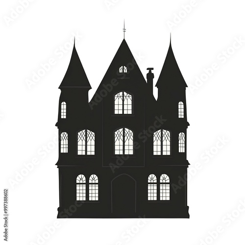 A flat design of a haunted house silhouette, rendered in black with simple window details, isolated on a crisp white background.