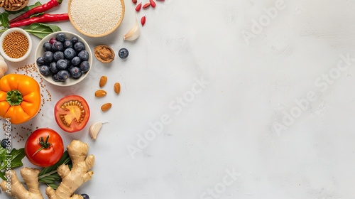 A flat lay image of various healthy foods, including chia seeds, pumpkin seeds, almonds, blueberries, and more, arranged on a grey surface