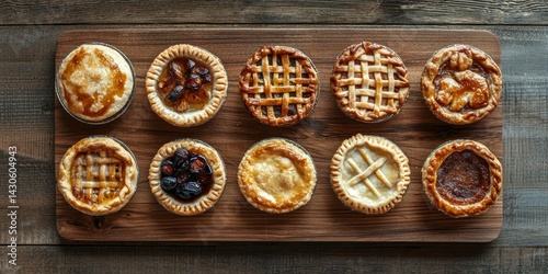 A flat lay of mini pies in different flavors, each with unique crust designs, placed on a wooden cutting board