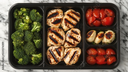 A flat lay of portion control containers filled with healthy food like quinoa, broccoli, and grilled chicken on a marble surface.
