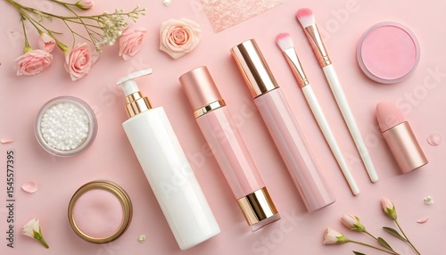 A flat lay photograph on a seamless, soft pastel pink background. Arrange a variety of cosmetic products and tools