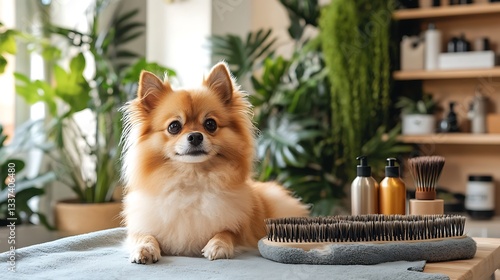 pomeranian, dog, grooming, salon, pet, fluffy, cute, adorable, calm, peaceful, serene, plant, greenery, natural light, soft light, brush, bottle, shampoo, conditioner, pampered, happy, relaxed, stylish, elegant, beauty, wellness, animal, furry, canino, pet shop