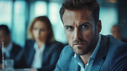 A focused businessman is sitting at the meeting room with colleagues and brainstorming about project : Generative AI