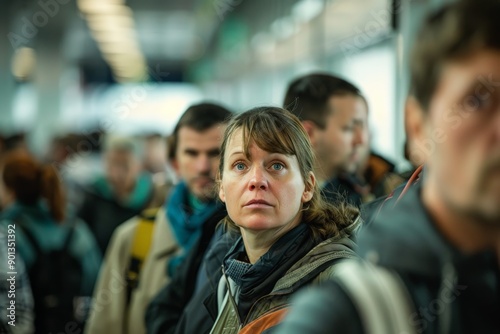 A focused commuter stands attentively among many people at a bustling urban transit station, illustrating the intensity and concentration typical of daily city commutes.