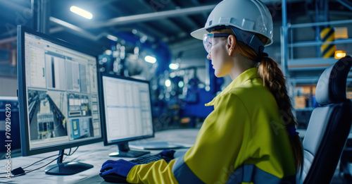 A focused female engineer monitors complex machinery systems, embodying expertise in a high-tech industrial setting