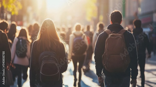A focused image of a group of college students walking to class, emphasizing the hustle and bustle of campus life
