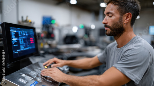 A focused male operator expertly controls a CNC machine in a modern workshop, showcasing precision and technology in manufacturing processes.