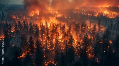 A forest engulfed in flames, depicting the destructive power of wildfires fueled by climate change-induced drought and heatwaves.