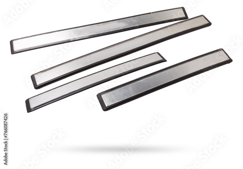 A four of black plastic decorative door sills in an automobile parsing for sale or repair in a workshop on a white isolated background in a photo studio.
