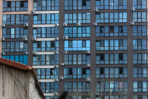architecture, modern, facades, building, apartment, residential, tower block, skyscraper, window, urban, city, city landscape, housing, home, real estate, property, contemporary, exterior, construction, development, investment, rent, finance, business, condo, flat, complex, large, pattern, geometric, repetition, frame, design, air conditioner, background, new, wall, glasses, street, living, commercial, office, metropolitan, structure, vertical, symmetry, detail
