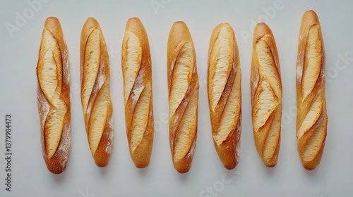A fresh baguette cut into several pieces, arranged neatly on a white surface