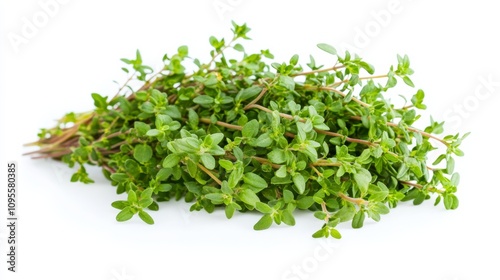 fresh, bunch, thyme, small, green, leaf, aromatic, scent, each, bright, colours, subtile, captured, precision, set, isolated, white, background, highlight, aroma