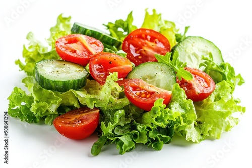 A fresh, colorful vegetable salad featuring crisp lettuce, juicy tomatoes, and sliced cucumbers, lightly seasoned and isolated on a clean white background.