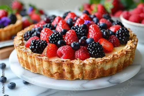 A fresh fruit tart with a crust made from oats and nuts, topped with a variety of berries and a light glaze.