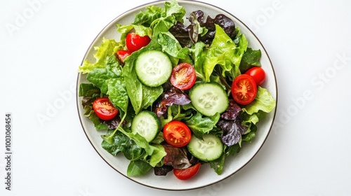 A fresh salad with mixed greens, cucumbers, and cherry tomatoes on a white plate.