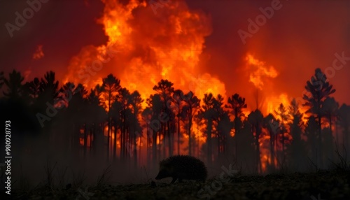 forest fire, hedgehog, frightened, forest, fire, outskirts, fear, blaze, danger, smoke, animal, hazard, escape, destruction, flames, threat, crisis, panic, edge, environment, evacuation, refuge, peril, safety, distressed, wildfire, impact, scorched, vulnerable