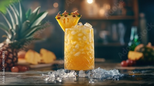 A full glass of pineapple drink with ice, fruit, and a kitchen background are shown on a table with crushed ice. frontal view. composition that is horizontal.