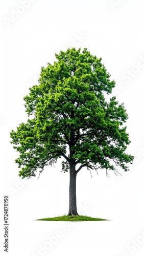 A full, isolated tree with vibrant green leaves and a sturdy trunk against a plain white background, symbolizing growth and nature