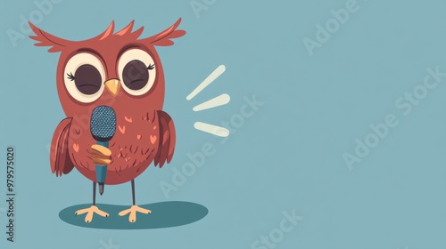 A funny cartoon owl holding a microphone, singing on a pastel blue background.