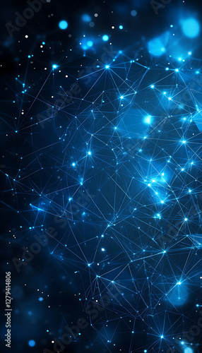 A futuristic abstract background featuring a grid of glowing triangles on a deep blue and black backdrop