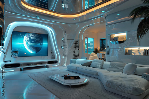A futuristic bedroom with a white bed. The room is illuminated with lights and has a modern, sleek design