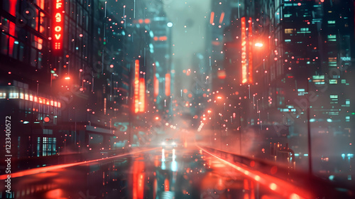 city, light, neon, rain, street, urban, fog, reflections, night, vehicle, building, technology, ambience, scenery, wet, skyline, atmosphere, modern, architecture, landscape, design, colours, aesthetic, futuristic, environment, depth, photo, visual, mood, travel, scene, urbanism, traffic, nightlife, perspective, road, glow, illumination, weather, contrast, artistic, vibrant, motion, solitude, mystery, rythm, energy, dynamic, surreal