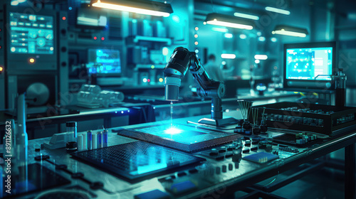 A futuristic cleanroom, robotic arms assembling microchips on a wafer, high precision